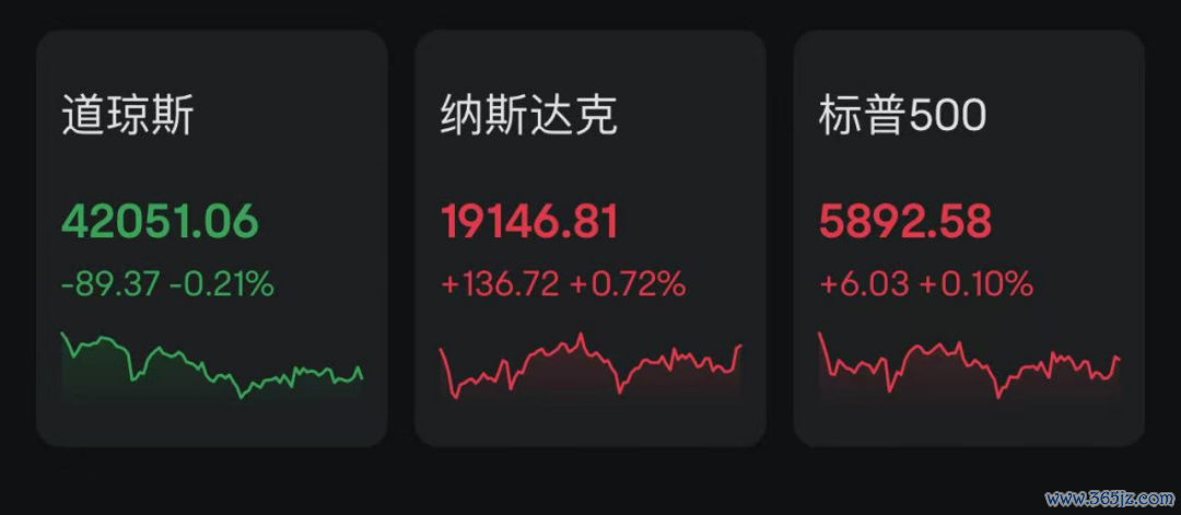 当地时间周三,美股三大指数涨跌不一。截至收盘,道指跌0.21%报42051.06点,标普500指数涨0.1%报5892.58点,纳指涨0.72%报19146.81点。